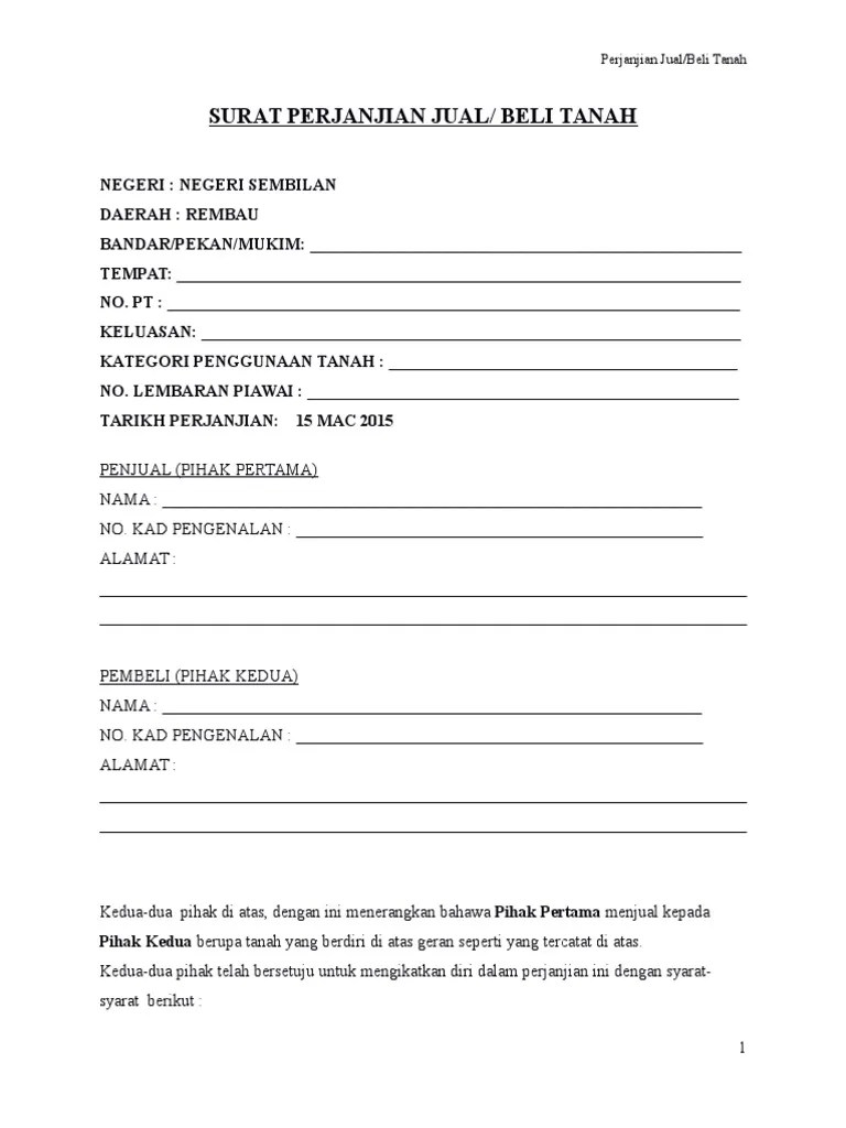 Pihak pertama memberikan jaminan penuh bahwa tanah berikut bangunan yang terletak di atasnya yang dijualnya adalah: Dengan adanya surat jual beli tanah ini maka . Berikut adalah panduan umum untuk perihal tanah di malaysia. Surat perjanjian jual beli tanah malaysia pdf. Contoh surat perjanjian jual beli rumah di malaysia. Pada hari ini, ahad, 28 haribulan jun 2009, kami yang bertanda tangan di bawah ini :